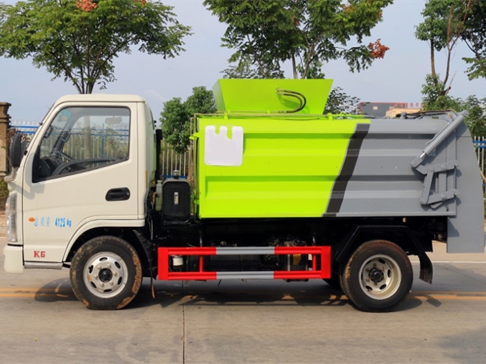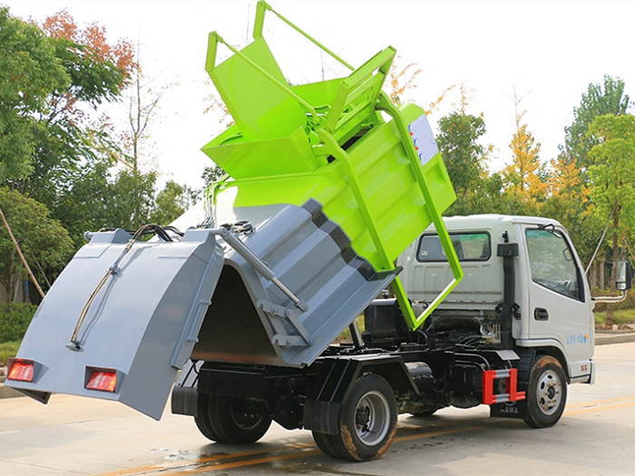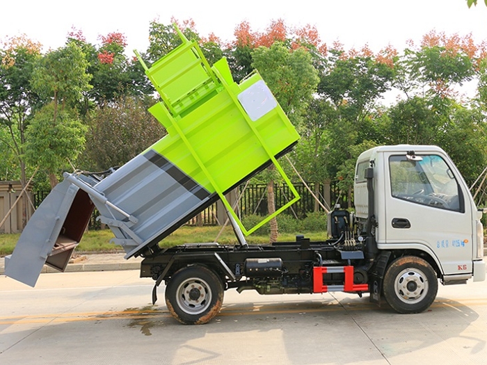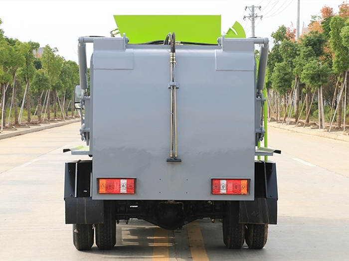 罐體采用4mm優(yōu)質(zhì)鋼材制作,方形罐體,罐體容積3~3.5方,罐體與后蓋上部采用鉸鏈連接,后蓋可利用液壓油缸打開卸料;罐體右側(cè)前部裝有掛桶提升機構(gòu)裝卸桶裝垃圾,罐體底部安裝液壓油缸實現(xiàn)罐體舉升自卸。后蓋采用液壓開啟、鎖緊。操作方式為室外手動液壓操作。