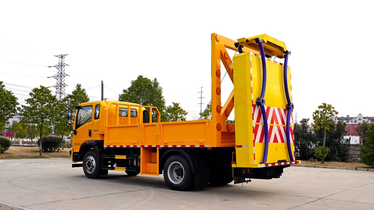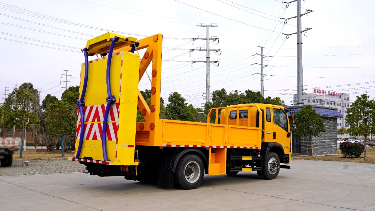 貨箱采用Q235國標優(yōu)質碳鋼板,箱體后部防撞緩沖模塊包采用國際知名技術產品100K防撞緩沖模塊,防撞緩沖吸能模塊主要由車載防撞緩沖墊和導向標志架組成,充當施工作業(yè)車輛后方的緩沖衛(wèi)士。 如若發(fā)生追尾事故,能夠在肇事車輛和前方施工作業(yè)區(qū)域之間構建一個緩沖區(qū)域,通過機具結構變形吸收撞擊的能量,最大限度地降低被保護人員及設備遭到碰撞的幾率。高性能液壓系統(tǒng),可實現(xiàn)快速舉升和落下操作。