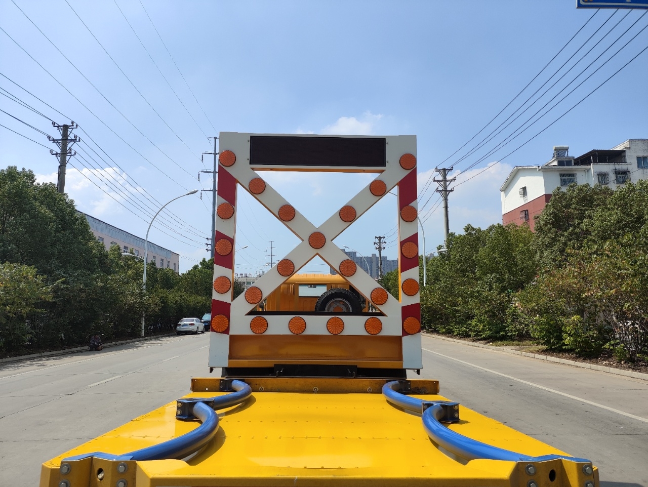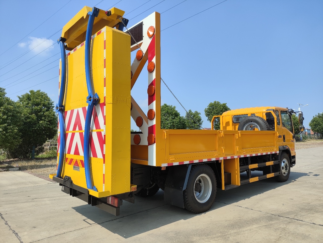 上裝配置:箱采用Q235國標(biāo)優(yōu)質(zhì)碳鋼板,箱體后部防撞緩沖模塊包采用國際知名技術(shù)產(chǎn)品100K防撞緩沖模塊,防撞緩沖吸能模塊主要由車載防撞緩沖墊和導(dǎo)向標(biāo)志架組成,充當(dāng)施工作業(yè)車輛后方的緩沖衛(wèi)士。 如若發(fā)生追尾事故,能夠在肇事車輛和前方施工作業(yè)區(qū)域之間構(gòu)建一個緩沖區(qū)域,通過機(jī)具結(jié)構(gòu)變形吸收撞擊的能量,最大限度地降低被保護(hù)人員及設(shè)備遭到碰撞的幾率。高性能液壓系統(tǒng),可實(shí)現(xiàn)快速舉升和落下操作。