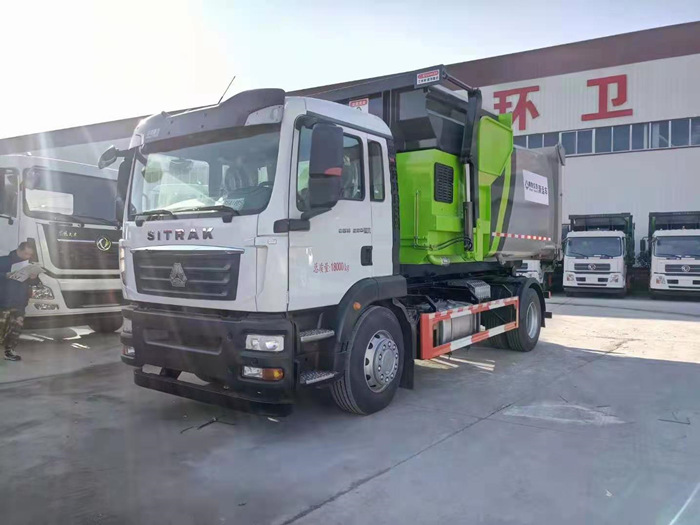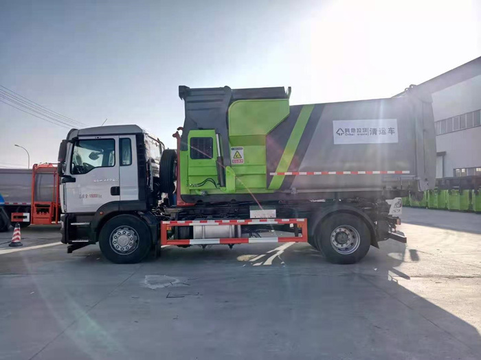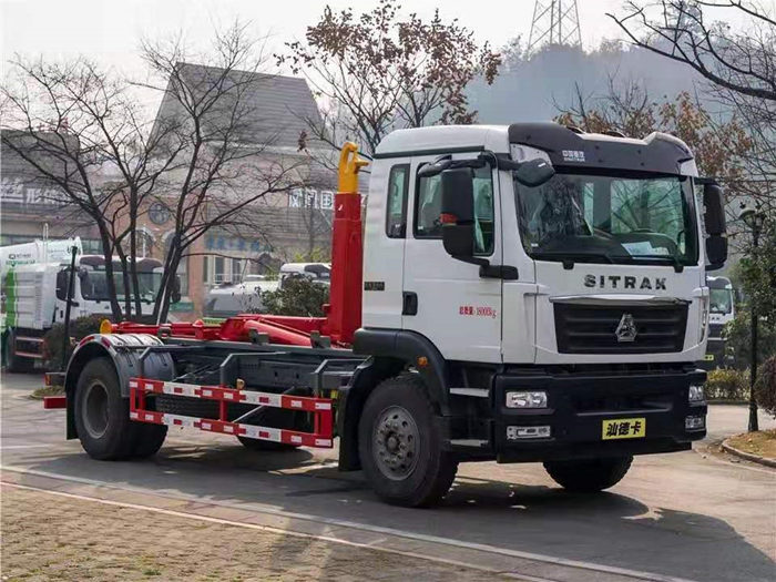 重汽汕德卡單橋勾臂垃圾車,垃圾斗容積10方(4500軸距),一體式主臂,鑄造托架,鍛造拖輪,選裝PLC**系統(tǒng),不銹鋼垃圾斗。