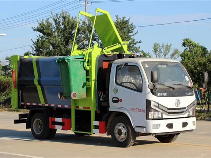東風(fēng)小多利卡側(cè)裝壓縮式對接垃圾車(容積:5-6立方) 底盤配置:采用東風(fēng)原裝底盤,東風(fēng)多利卡D6單排前翻駕駛室,3308mm軸距,云內(nèi)126/錫柴110/全柴115馬力發(fā)動機(jī),5檔變速箱,4噸后橋,7.50R16鋼絲胎,氣剎,方向助力,ABS,空調(diào)。