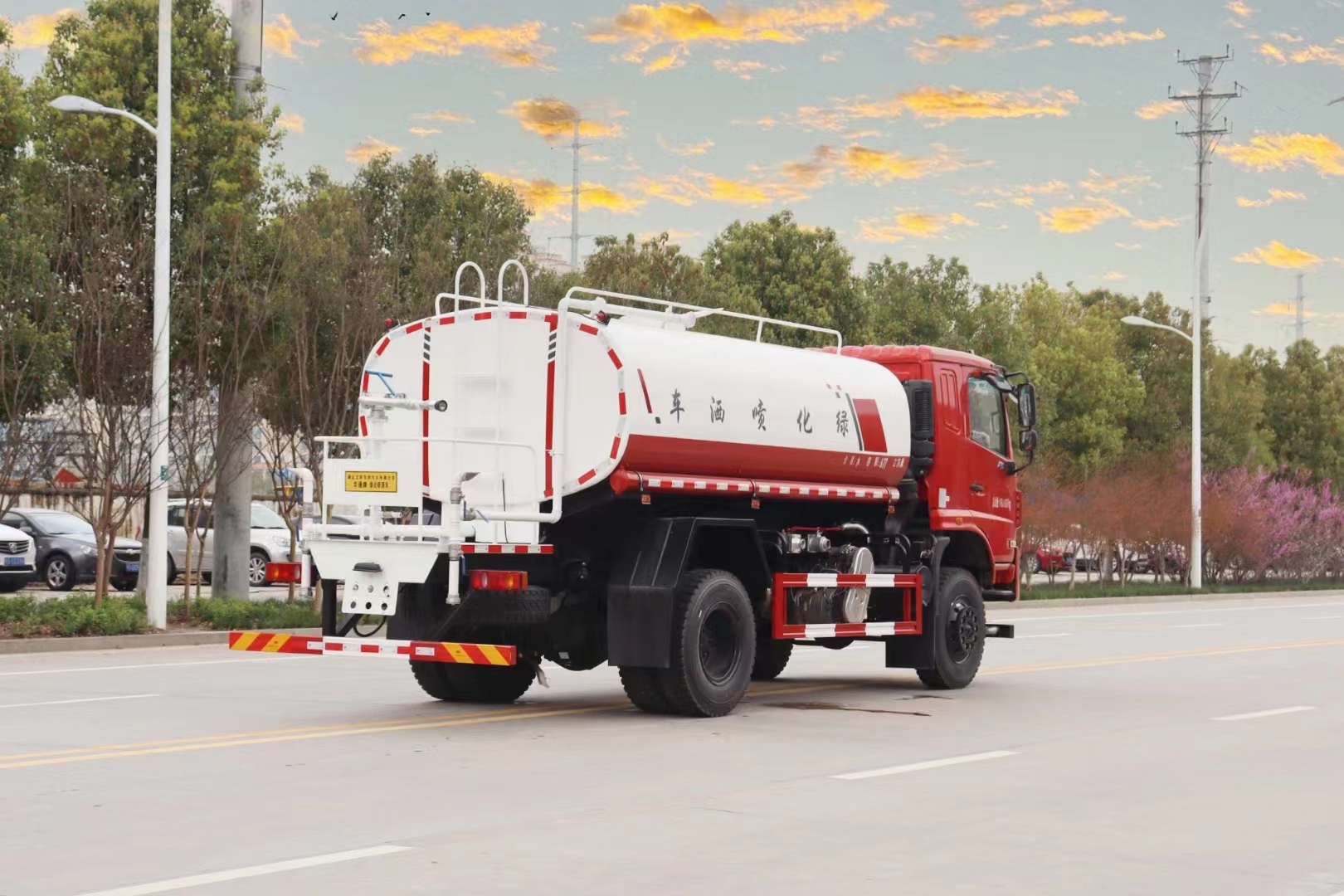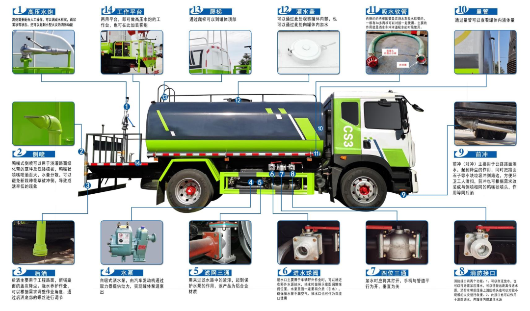 腰沖:用于公路路面灑水,起到降塵的作用,同時(shí)把路面石子等小塊垃圾沖到路邊,方便環(huán)衛(wèi)工人清掃 |