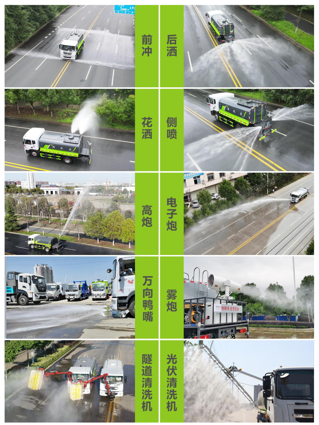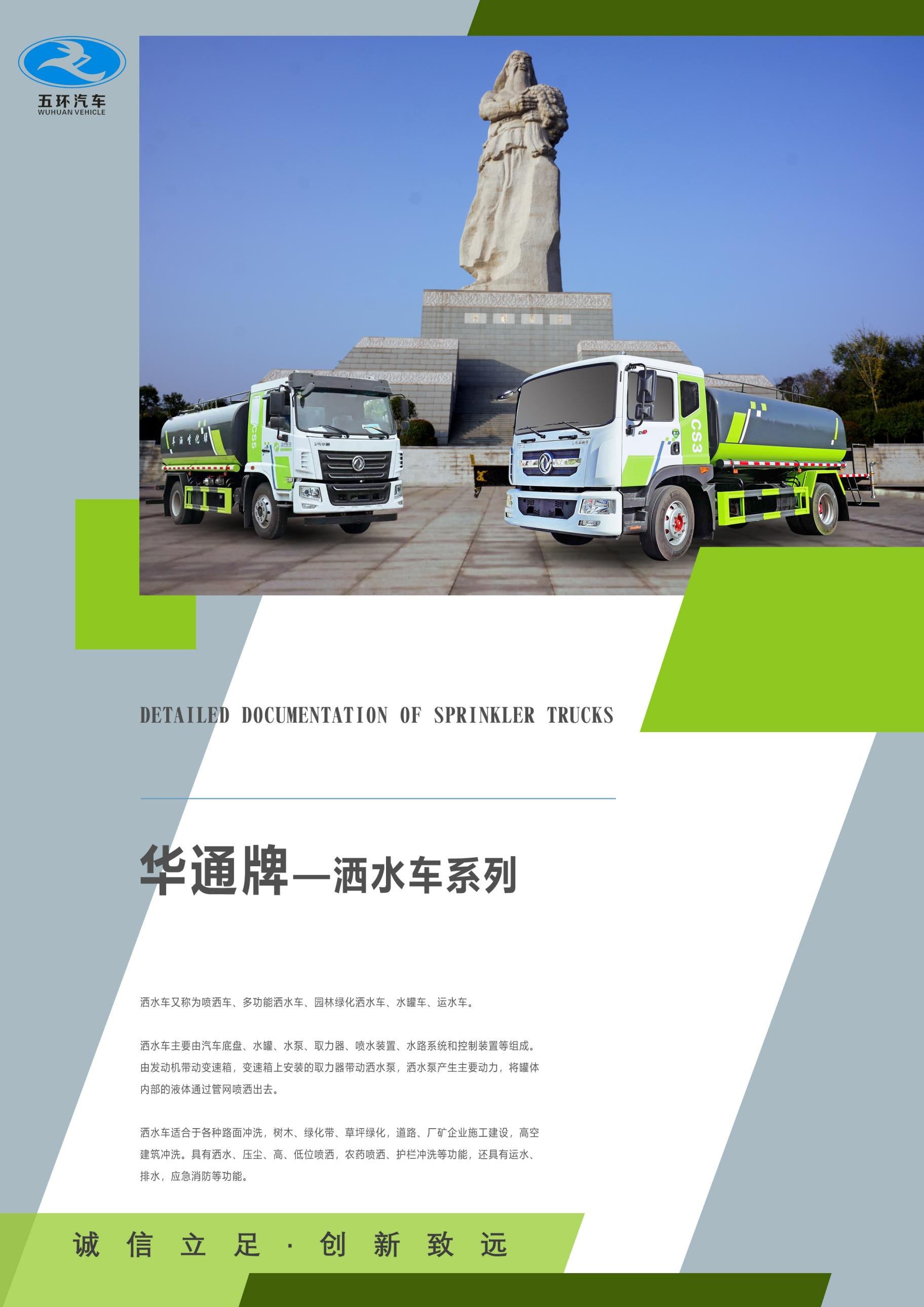 我公司生產(chǎn)灑水車(chē),標(biāo)配前沖、后灑、側(cè)噴、后置式工作平臺(tái)、平臺(tái)上有高壓水炮(可360°旋轉(zhuǎn),可調(diào)成柱狀最大射程35米,也可調(diào)成霧狀最大射程15米,可調(diào)成:直沖狀、大雨、中雨、小雨、毛毛雨),配備優(yōu)質(zhì)大功率專(zhuān)用灑水泵,取力器,雜物過(guò)濾網(wǎng),國(guó)標(biāo)通用65型消防接口(可通過(guò)消防栓加水)、1套自流球閥系統(tǒng)(可自吸自排,可從河里或池塘抽水到罐體,最大吸程7米),2根引水鋼絲膠管。水泵、取力器、球閥、濾網(wǎng)均為國(guó)家標(biāo)準(zhǔn)產(chǎn)品,主管道加粗,法蘭墊、法蘭盤(pán)加厚,萬(wàn)向前沖,大通徑球閥,具有性能優(yōu)良,工作可靠、效率高、流量大、維修方便等特點(diǎn)。