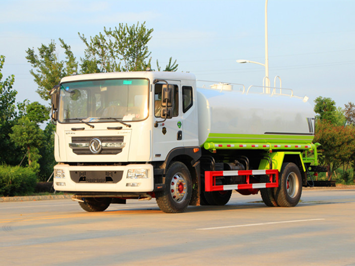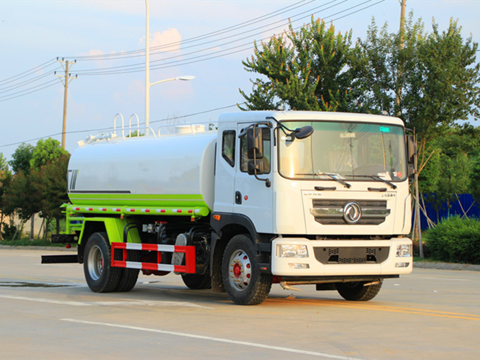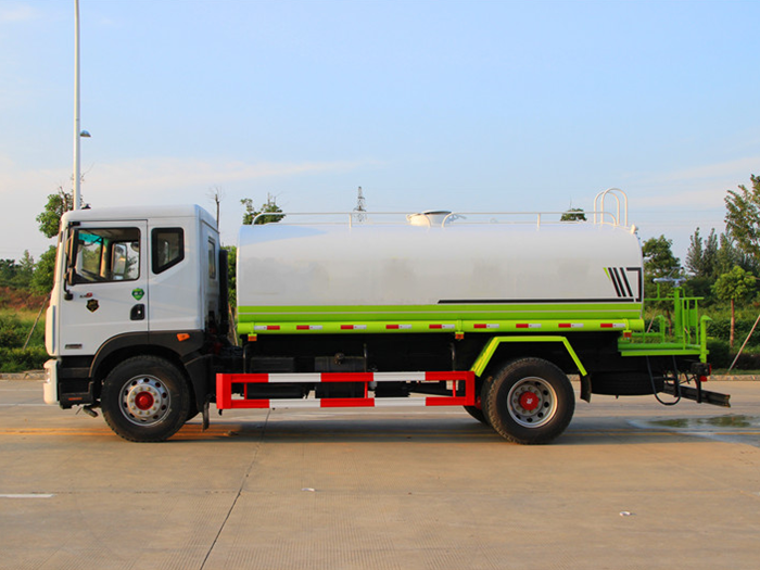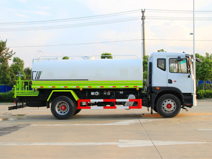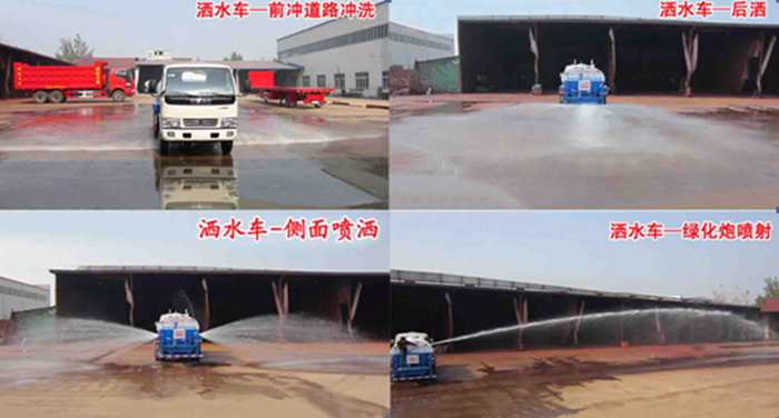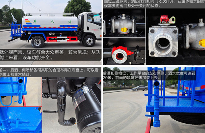 改裝配置:罐體用4MM碳鋼板制作,罐內隔板具有防波作用,以減低汽車行駛時罐體液體的沖擊。整車帶一個專用灑水泵(垂直最大吸程6米),灑水寬度14米,射程28米。多功能灑水車配備2個前沖(噴)(能將路面泥巴、塵土、垃圾沖干凈);2個后灑(能均勻地將水灑在路面,一次灑水寬度14米)、2個側噴(花灑)(能均勻地將路旁綠化帶澆灌)、帶1個后工作平臺,平臺上安裝1個綠化灑水高炮(灑水炮可全方位旋轉,可連續(xù)調成直沖狀、大雨、小雨、毛毛雨,霧狀可調節(jié)沖洗高大樹木),引水時間<5min,流量90m3/h。帶1個消防接頭,帶1個自流閥,1個過濾裝置、人性化爬梯及側防護欄,安裝灑水音樂喇叭。