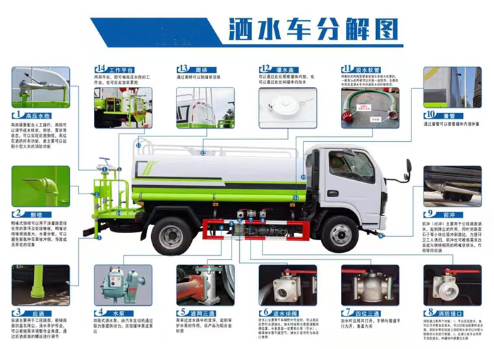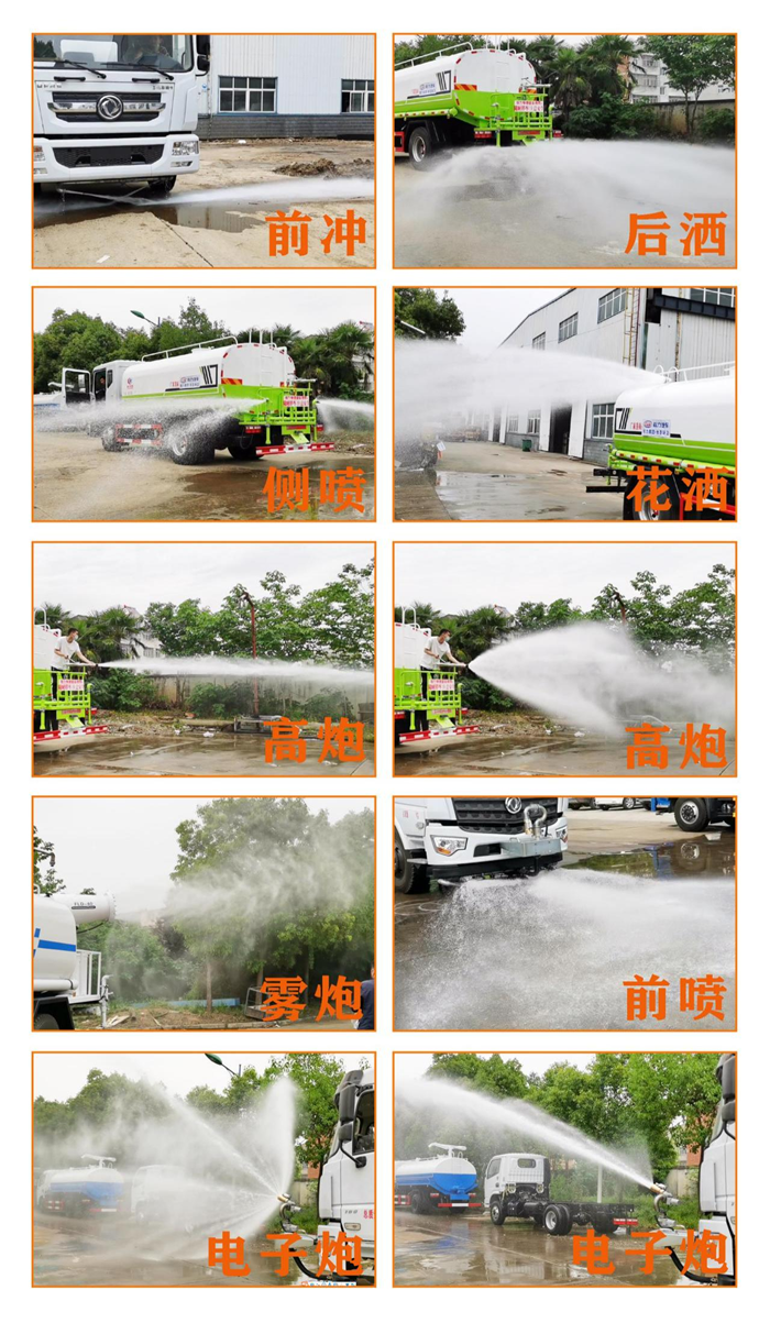 罐體尺寸:4300*2280*1400mm,天億60/90水泵,全車大通徑球閥,主管道76,沖孔平臺,帶前沖,后灑,側噴及尾部工作平臺綠化高炮。