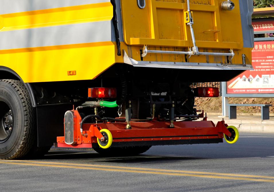 在底盤后軸之后,布置一個可升降吸盤,吸盤內置滾刷,滾刷旋轉由液壓馬達驅動,內置高壓噴水桿,側高壓噴水桿。