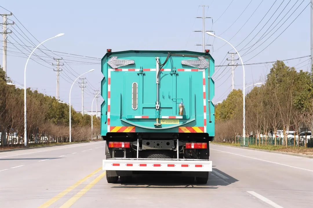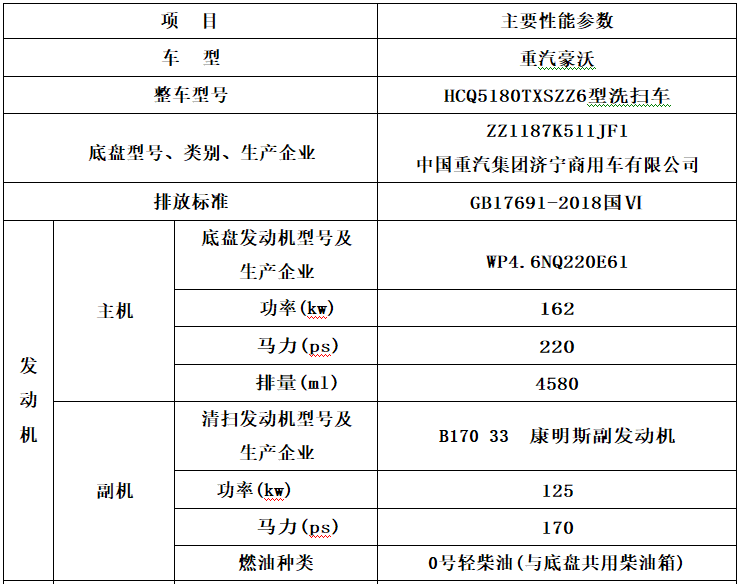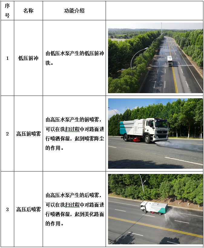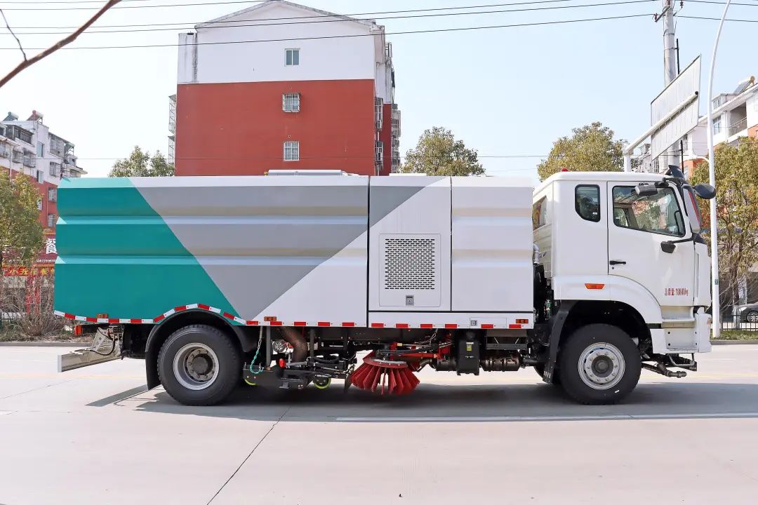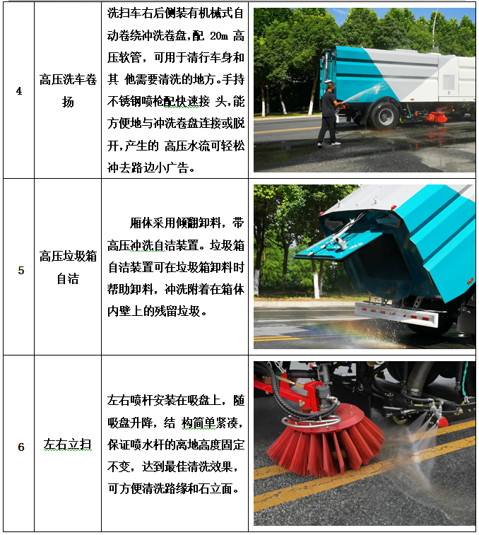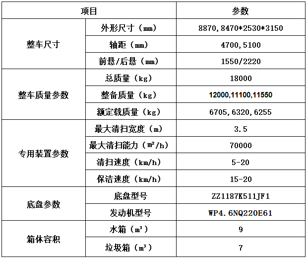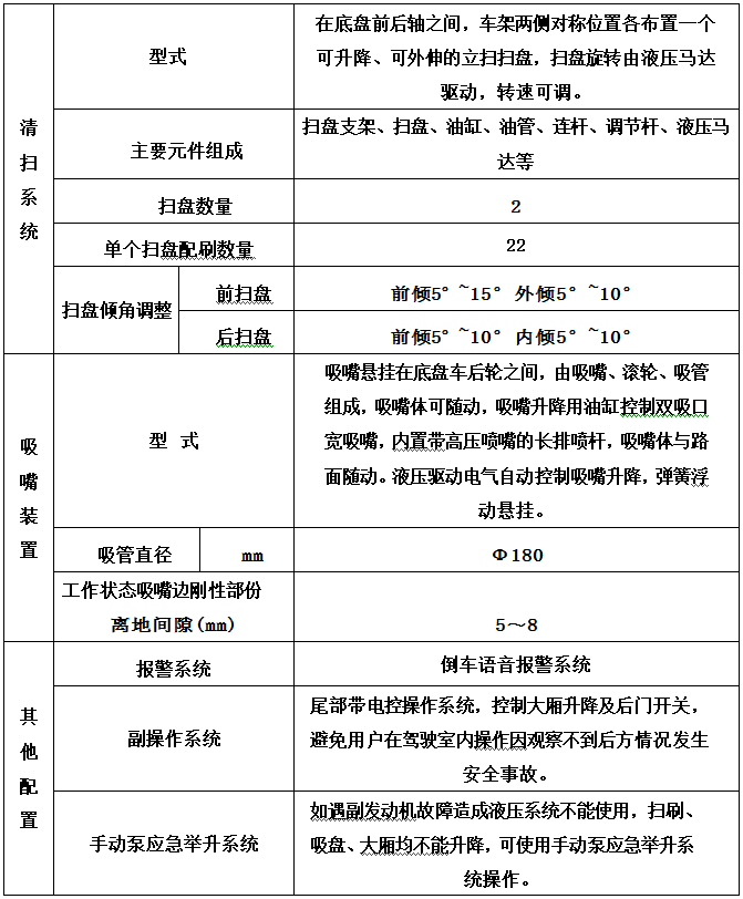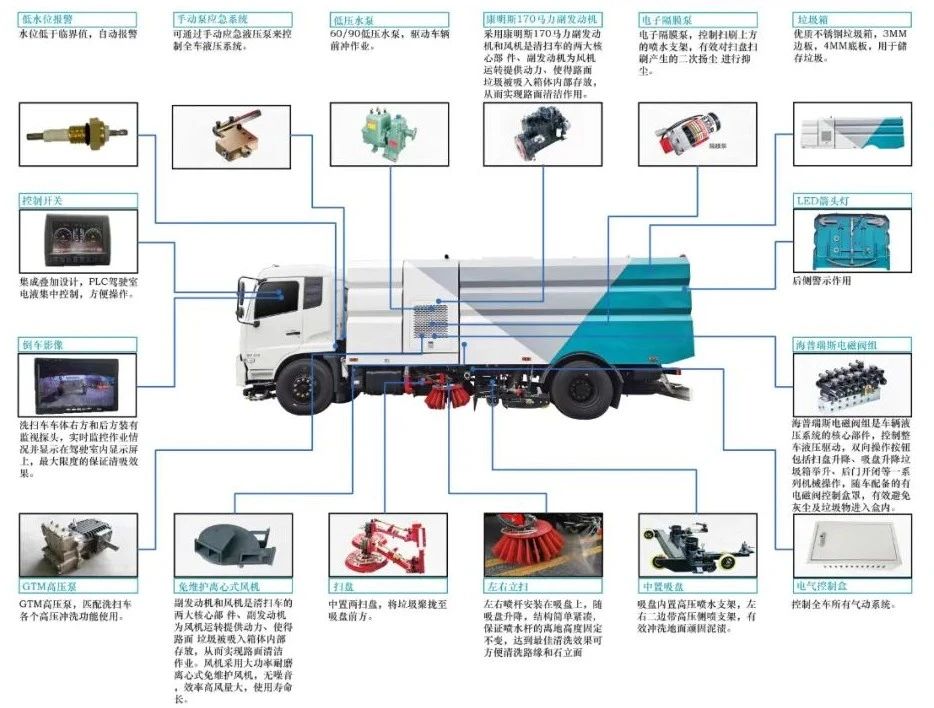 加裝副發(fā)動(dòng)機(jī)、風(fēng)機(jī)、高壓水泵、清水箱、垃圾箱、左右立掃、帶噴水桿的寬吸嘴、低壓沖洗系統(tǒng)、掃盤降塵系統(tǒng)、液壓系統(tǒng)、專用裝置電控系統(tǒng)和副車架等改裝而成,副發(fā)動(dòng)機(jī)采用康明斯170馬力副發(fā)動(dòng)機(jī),帶2個(gè)中置掃盤,力沃馬達(dá),低壓水泵,GTM高壓水泵(前沖側(cè)噴中噴后噴霧沖洗水槍垃圾箱自潔裝置);高壓路沿清洗噴頭;不銹鋼垃圾箱;不銹鋼管高壓管路;PLC一鍵控制;尾部LED箭頭燈;垃圾箱、水箱均帶防溢低水位報(bào)警裝置;倒車及洗掃狀態(tài)室內(nèi)監(jiān)視器。20米沖洗卷盤。水箱9方,垃圾箱7立方。