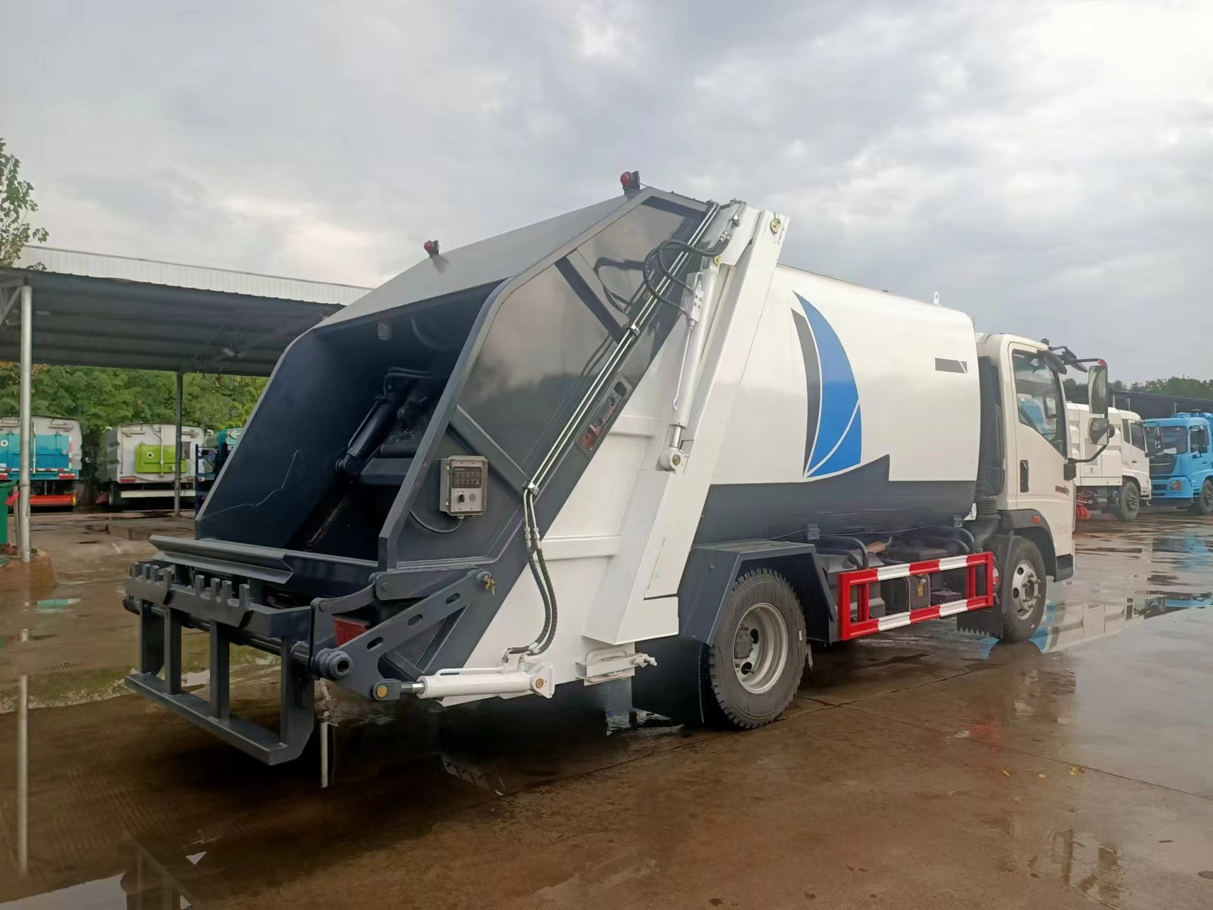 后裝卸式垃圾車又稱壓縮式垃圾車(以下簡稱垃圾車)是用于城鎮(zhèn)袋裝、桶裝、散裝生活垃圾物的收集、運(yùn)輸、卸料作業(yè)的專用車輛。垃圾被刮滑機(jī)構(gòu)刮進(jìn)車廂,通過與推板之間的擠箱,使垃圾較高密度、較均勻地分布在車箱內(nèi),直至裝滿為止;該垃圾車的收運(yùn)方式是目前世界上廣泛采用的垃圾收運(yùn)方式,其專用裝置的功能均以汽車發(fā)動機(jī)為動力,通過液壓機(jī)構(gòu)手動或電控來實現(xiàn)。車輛的箱體、裝填器又稱斗體及污水箱均采用優(yōu)質(zhì)炭鋼板全密封焊接結(jié)構(gòu),具有強(qiáng)度高、重量輕、不產(chǎn)生二次污染等優(yōu)點。