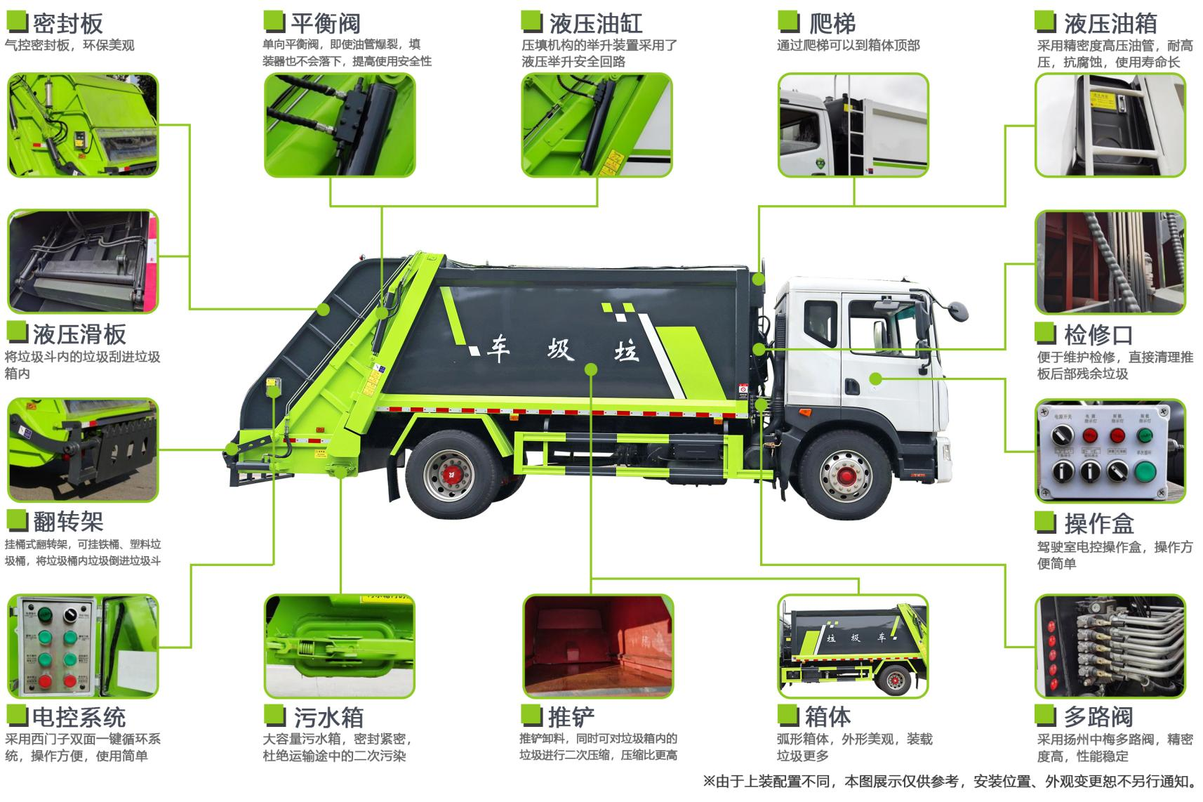 3. 油泵采用國內(nèi)知名品牌海普瑞斯液油泵,加裝壓實閥,增加壓縮密度、提高裝載量。裝載量相當(dāng)于同噸級排非壓縮垃圾的兩倍半。